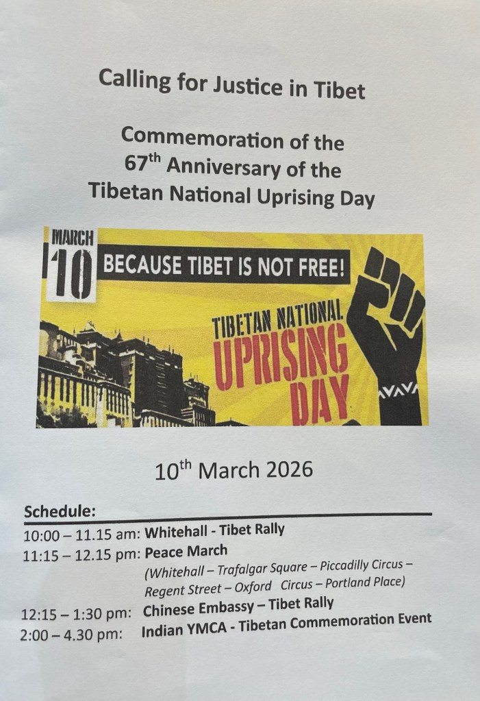 The afternoon will feature a cultural commemoration attended by the Office of Tibet (London), advocates, community leaders, and supporters. A Tibetan cultural programme begins at 2:30 pm, and refreshments – including traditional Tibetan momo – will be served.