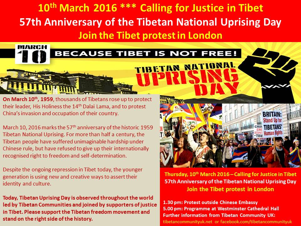 March 10, 2016 marks the 57th anniversary of the historic 1959 Tibetan National Uprising. For more than half a century, the Tibetan people have suffered unimaginable hardship under Chinese rule, but have refused to give up their internationally recognised right to freedom and self-determination.