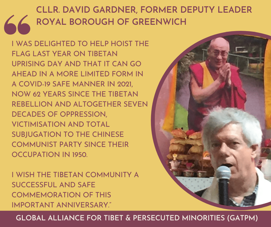 Cllr. David Gardner, former Deputy Leader of RBG, who helped to organise the flag hoisting ceremony, said, “The Tibetan community in exile has had a long association with our Royal Borough of Greenwich, and in my Woolwich Common ward in particular. I was delighted to help hoist the flag last year on Tibetan Uprising Day and that it can go ahead in a more limited form in a Covid-19 safe manner in 2021, now 62 years since the Tibetan rebellion and altogether seven decades of oppression, victimisation and total subjugation to the Chines Communist Party since their occupation in 1950.