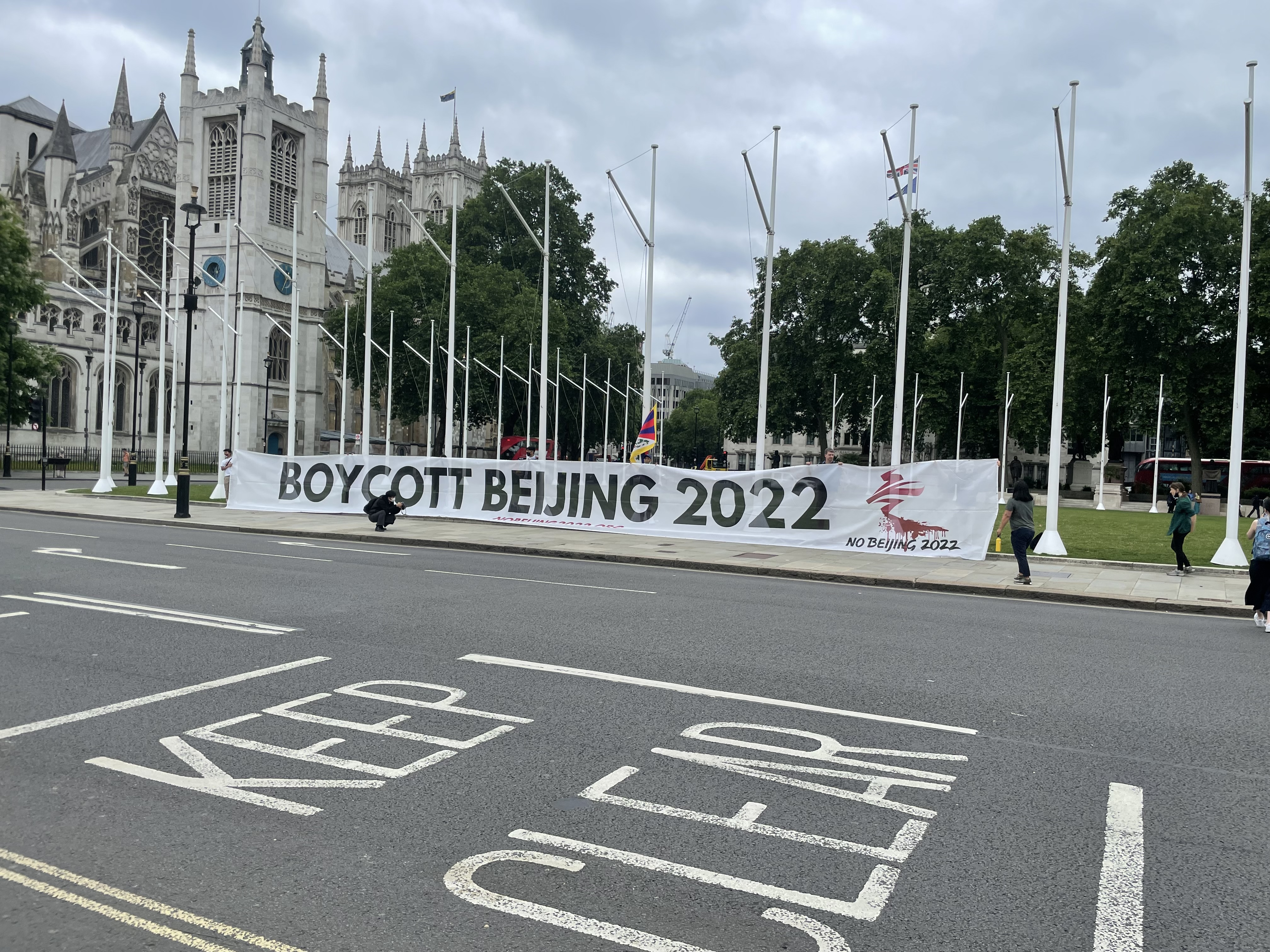 Hours before the debate, Tsering Passang from the Global Alliance for Tibet & Persecuted Minorities (GATPM), joined Free Tibet and members of the Tibetan Community to unfurl a banner that reads “Boycott Beijing 2022: NoBeijing2022.org” in Parliament Square, facing the UK Parliament.