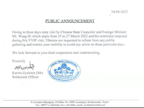 Meanwhile, Tibetans in Nepal face restriction on their movement and public gatherings. This is because the Chinese Foreign Minister Wang Yi is undertaking a 3-day State Visit to Nepal from 25th to 27th March. Over 10,000 Tibetan refugees live in Nepal. Notices were issued to avoid public gatherings and restrict their mobility during these three days. Local officials issued this caution to Tibetans to avoid being arrested by the police.