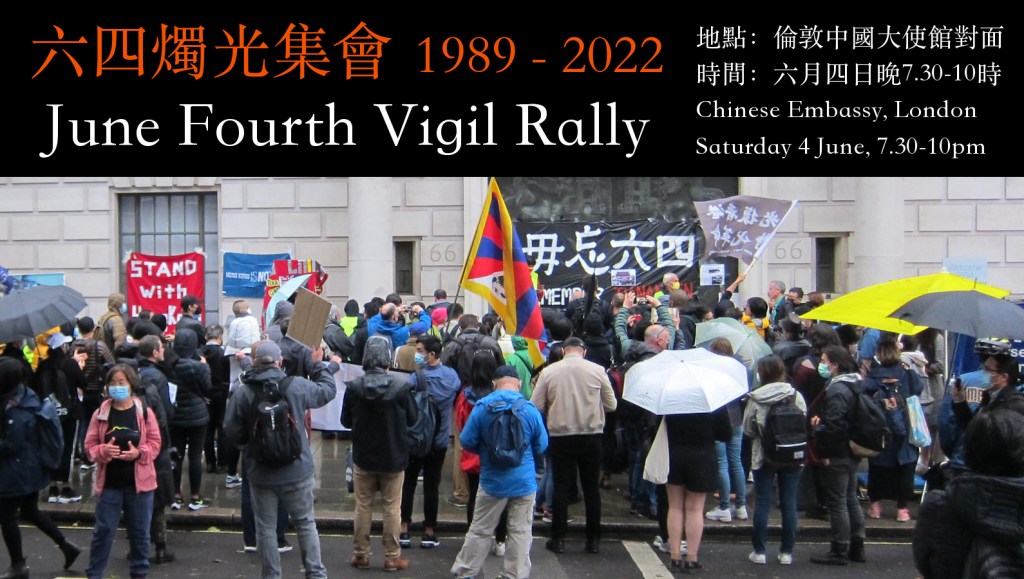 今年是1989年民主運動和六四屠殺33週年。我們一如既往地聲援天安門母親,堅定不移地支持她們對調查真相、追究責任、還受難者以正義的訴求。我們將於 2022 年 6 月 4 日晚上 7:30-10 點在倫敦中國大使館前舉行燭光集會。