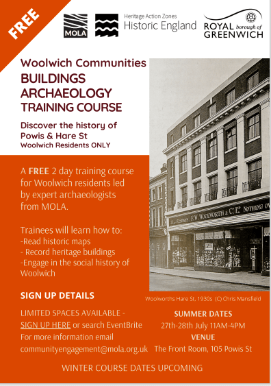 Registration via: https://www.eventbrite.com/e/woolwich-communities-building-archaeology-training-course-tickets-371327038167?aff=EmailLink For more information email communityengagement@mola.org.uk