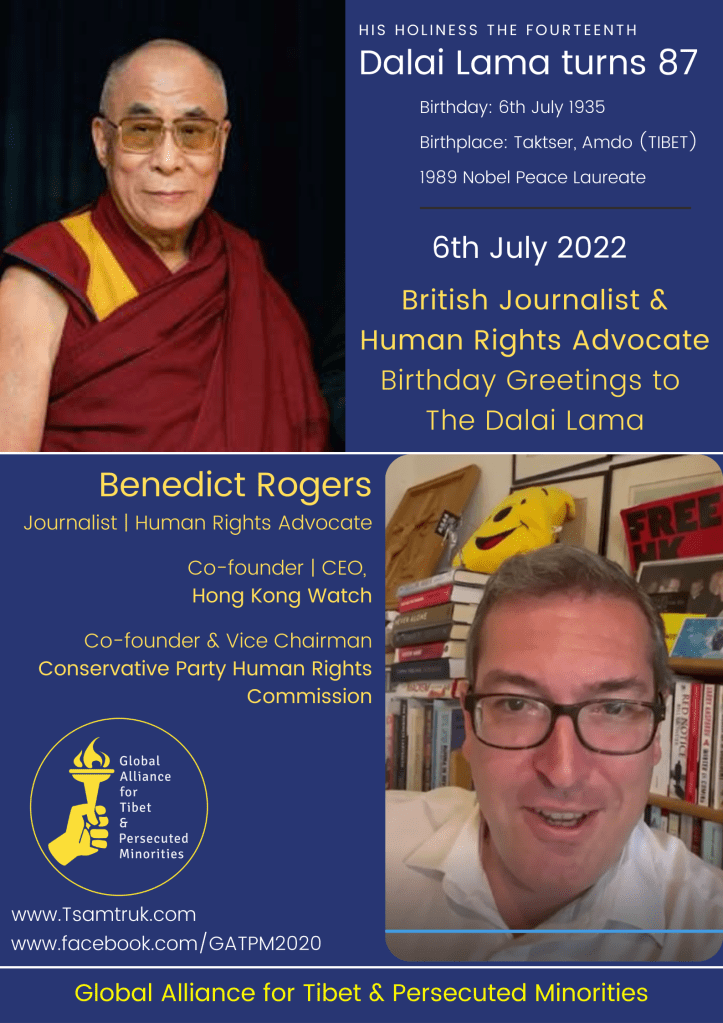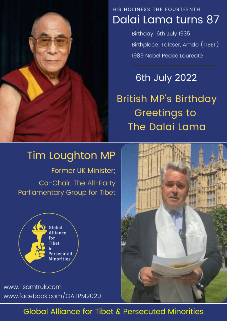 The Global Alliance for Tibet & Persecuted Minorities would like to thank our amazing friends – Hon. Tim Loughton MP, Benedict Rogers Esq. and Dr Richard Moore for sharing their warm Tributes to His Holiness the Dalai Lama on his 87th Birthday.