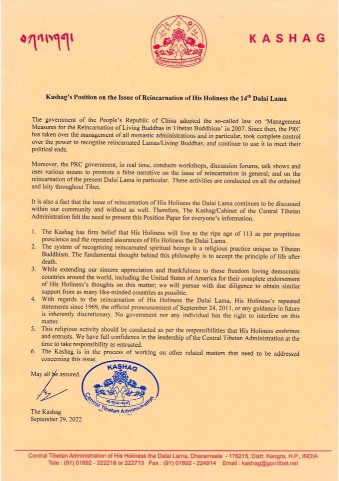 Kashag’s Position on the Issue of Reincarnation of His Holiness the 14th Dalai Lama