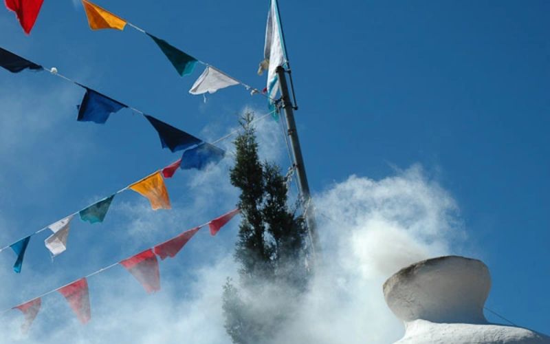 We used to offer sang-sol on auspicious days, especially the 15th of every month in the lunar calendar. The ceremony has been practiced over thousands of years by Tibetans across Tibet and is widely prevalent among the diverse Himalayan Buddhist communities. Often it is accompanied with the unfurling of the lung-ta or prayer flags, which are meant to bring auspiciousness in the lives of the individuals. According to Tsewang Gyalpo Arya, Lungta prayer flags are hoisted on auspicious days, especially during the Tibetan New Year, Losar. When things are not going well and smoothly, people often hoist Lungta flags and perform Sangsol [burning of juniper or herbs]. What is interesting is that both sang-sol and unfurling of lung-ta are pre-Buddhist practices. These rituals can be traced to the Bon period and are modes of propitiating the local deities of Tibet and the Himalayas. These deities reside in the natural surroundings and are the autochthonous beings of the land.