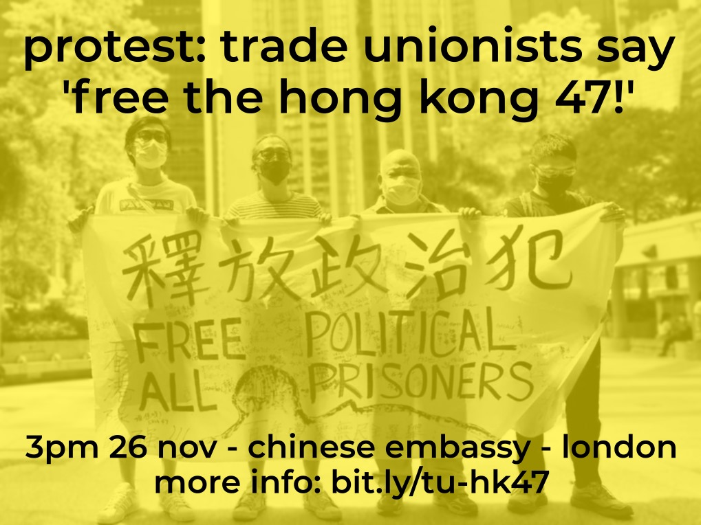 On November 27, the final stage of the trial of the “Hong Kong 47” will begin. On the eve of this final trial, on November 26, the Workers Against the CCP (WACCP) is organising a protest outside the Chinese Embassy in London and invites everyone, including the trade union members and activists to support and show their solidarity with the 47 people in Hong Kong, who face jail sentences simply for organising a democratic protest. The protest also aims to express solidarity with all those who are fighting for labor, democracy and justice in Hong Kong.