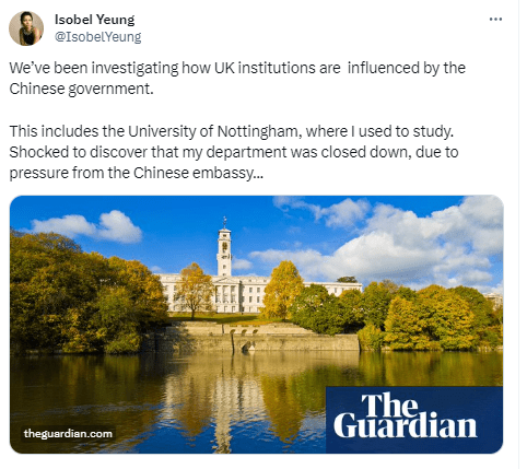 Isobel Yeung, who investigates China’s relationships with the UK and it’s institutions, posted on X/Twitter: “We’ve been investigating how UK institutions are influenced by the Chinese government. This includes the University of Nottingham, where I used to study. Shocked to discover that my department was closed down, due to pressure from the Chinese embassy…”