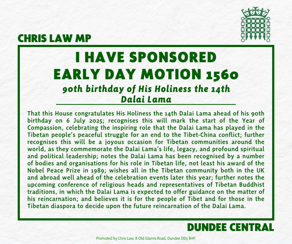 On 25th June, the UK Parliament passed Early Day Motion 1560, tabled by Chris Law MP, Chair of the All-Party Parliamentary Group for Tibet. The cross-party motion recognised the Dalai Lama’s enduring spiritual and political leadership, and declared: