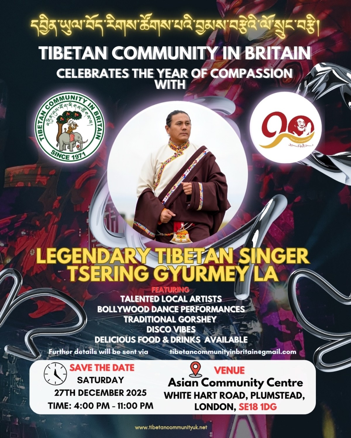 The Tibetan Community in Britain is honoured to present the UK Compassionate Concert 2025, an evening of music, memory, and meaning featuring the pioneering Tibetan singer Tsering Gyurmey. Local talented artists, Bollywood dance performances, and traditional Gorshey will also feature the evening.