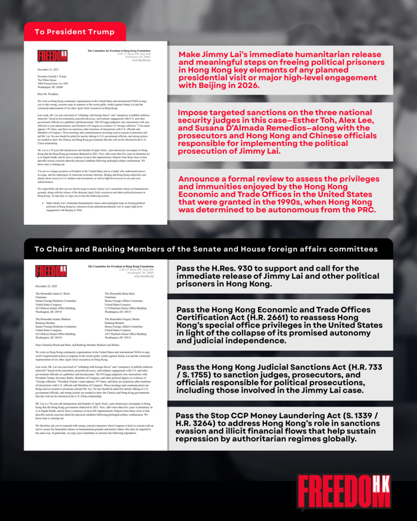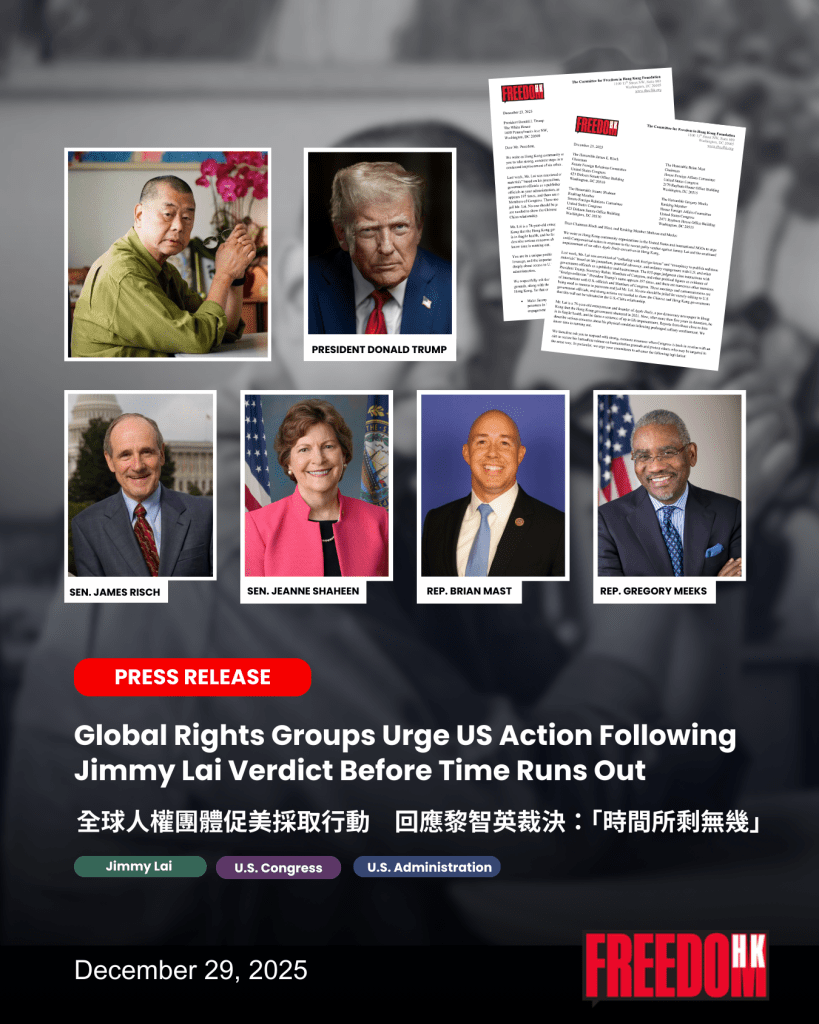 WASHINGTON, D.C., (Dec. 29, 2025) — The Committee for Freedom in Hong Kong Foundation (CFHK Foundation) on Monday released two open letters, signed by more than 50 U.S. and international organizations, urging President Donald Trump and key Congressional leaders to take immediate, concrete action following the guilty verdict of Hong Kong publisher Jimmy Lai, warning that his case represents a grave escalation in Beijing’s crackdown on press freedom and political dissent.