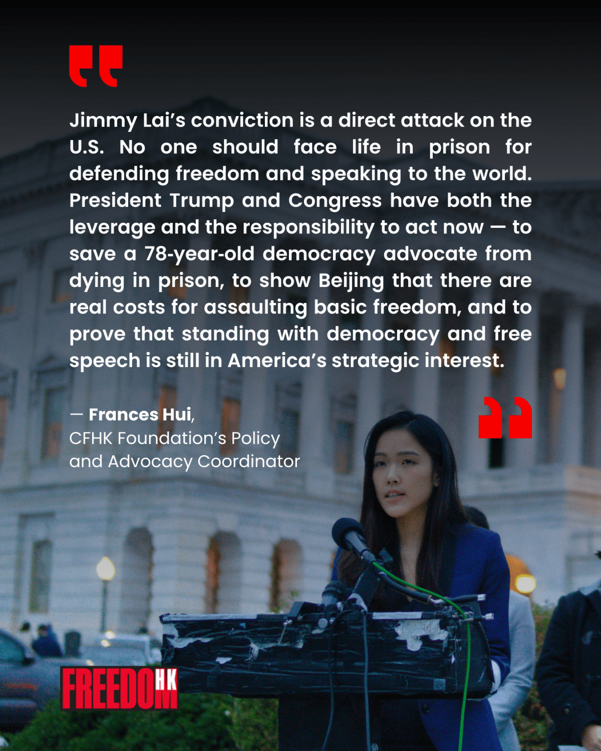 “Jimmy Lai’s conviction is a direct attack on the U.S. Lai is being punished merely for his journalism, peaceful advocacy, and ordinary engagement with U.S. officials,” Frances Hui, the CFHK Foundation’s policy and advocacy coordinator, said. “No one should face life in prison for defending freedom and speaking to the world. President Trump and Congress have both the leverage and the responsibility to act now — to save a 78‑year‑old democracy advocate from dying in prison, to show Beijing that there are real costs for assaulting basic freedom, and to prove that standing with democracy and free speech is still in America’s strategic interest.”