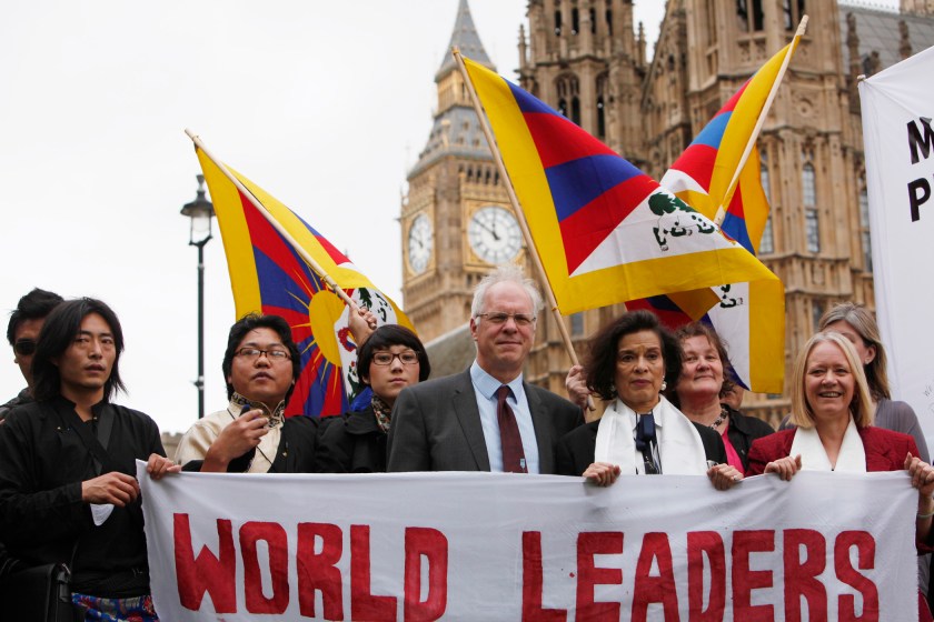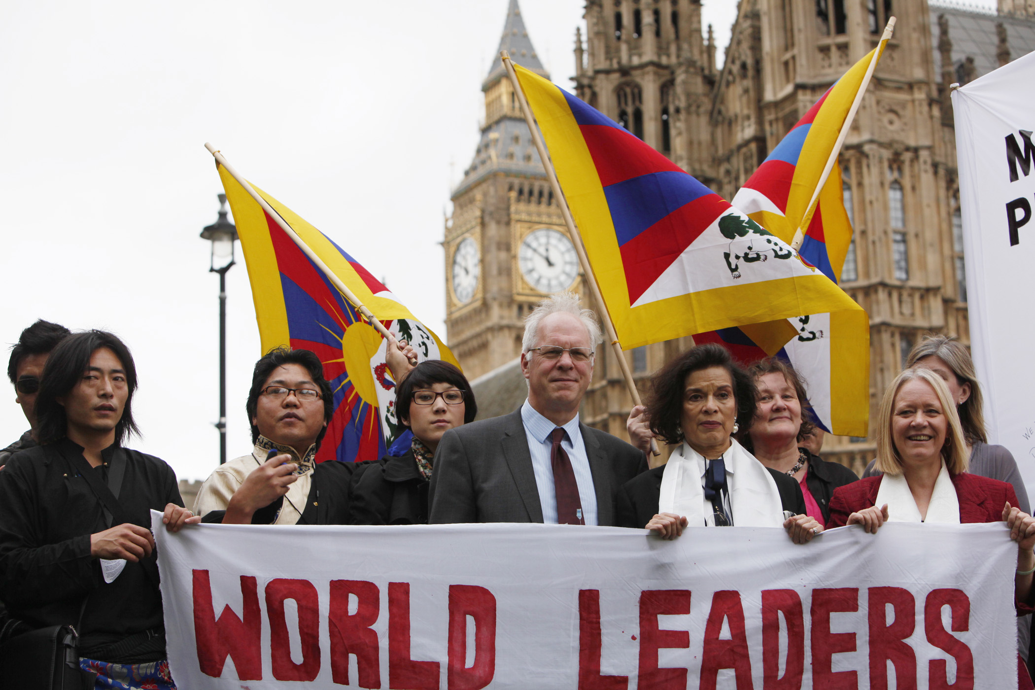 From left, Thenley Sangpo, Tsering Passang (Tibetan Community in Britain), Norzin-Lhamo Dotschung (Tibetan Youth Association in Europe), Nic Dakin MP, Bianca Jagger, Philippa Carrick (Tibet Society) and Cathy Jamieson MP stand outside Houses of Parliament in London demanding Prime Minister Cameron take urgent action over human rights atrocities in Tibet. Other representatives from Tibet human rights groups also spoke at the conference.