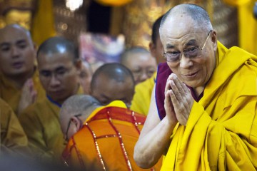 Tibetan spiritual leader the Dalai Lama greets devotees as he arrives to give a religious talk at the Tsuglakhang temple in Dharmsala, India, Monday, July 01, 2013. The two-day talk was organized on request from a Buddhist group in Vietnam. (AP Photo/ Ashwini Bhatia)